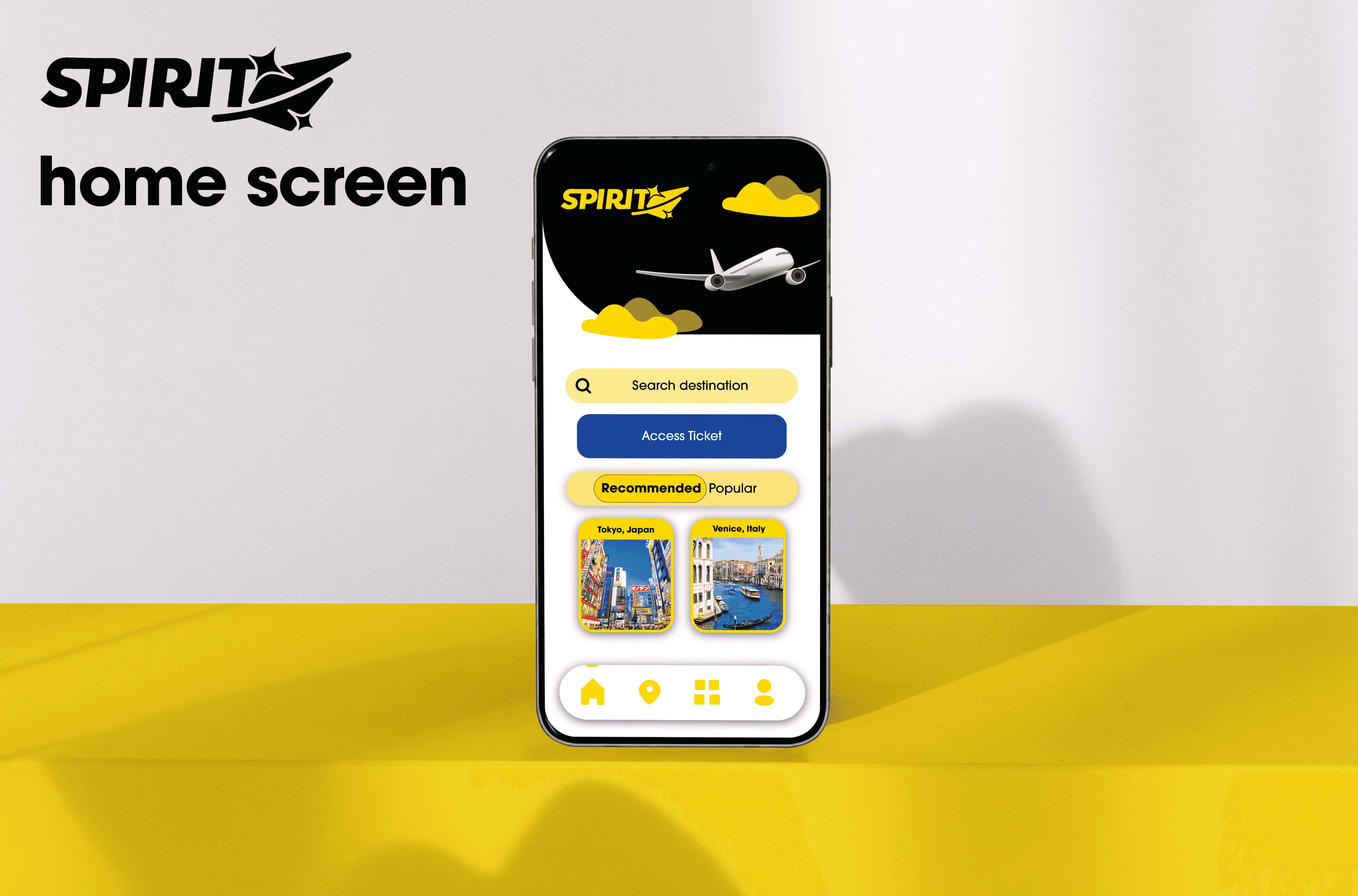 For the app screens, I focused on making the new branding feel clean, easy to use, and more modern than the current Spirit experience. The home screen is simple and straight to the point—clear search, quick access buttons, and visuals that match the updated style.